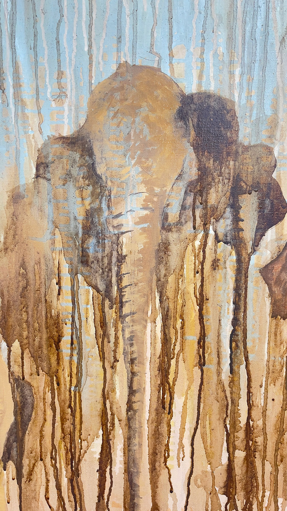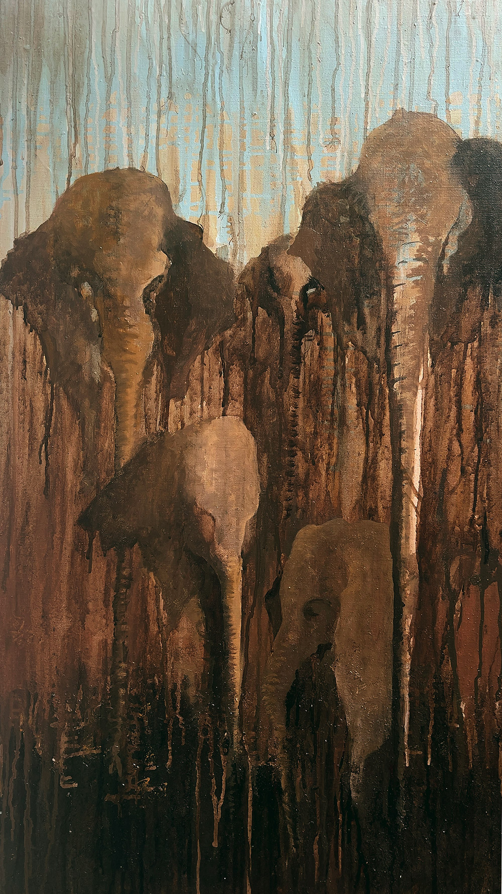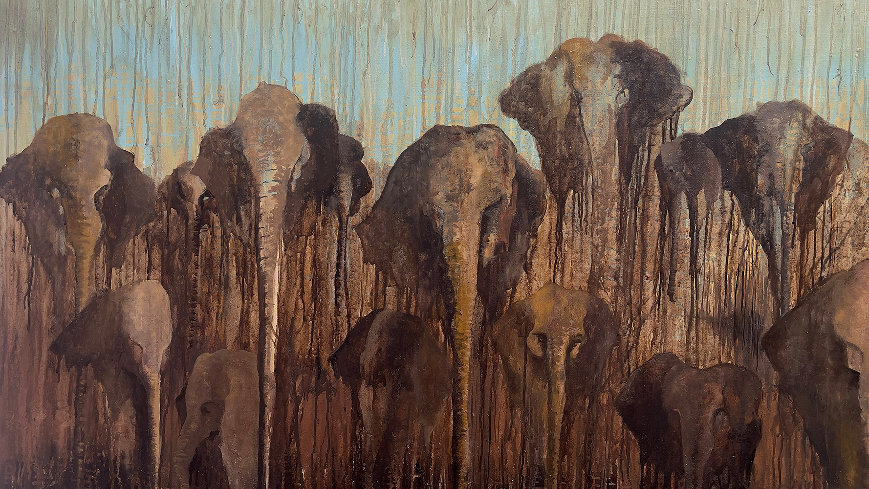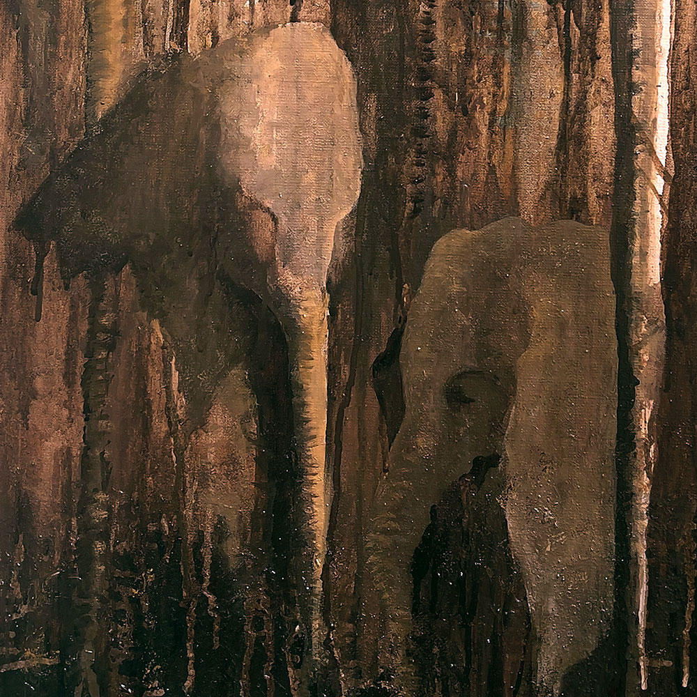 The silhouettes of elephants emerge and dissolve within the thicket. They do not walk: they seem to float in a cadence older than time itself, a murmur the jungle has not yet forgotten. Their bodies, reduced to stains and strokes, merge with the vegetal pulse that surrounds them.