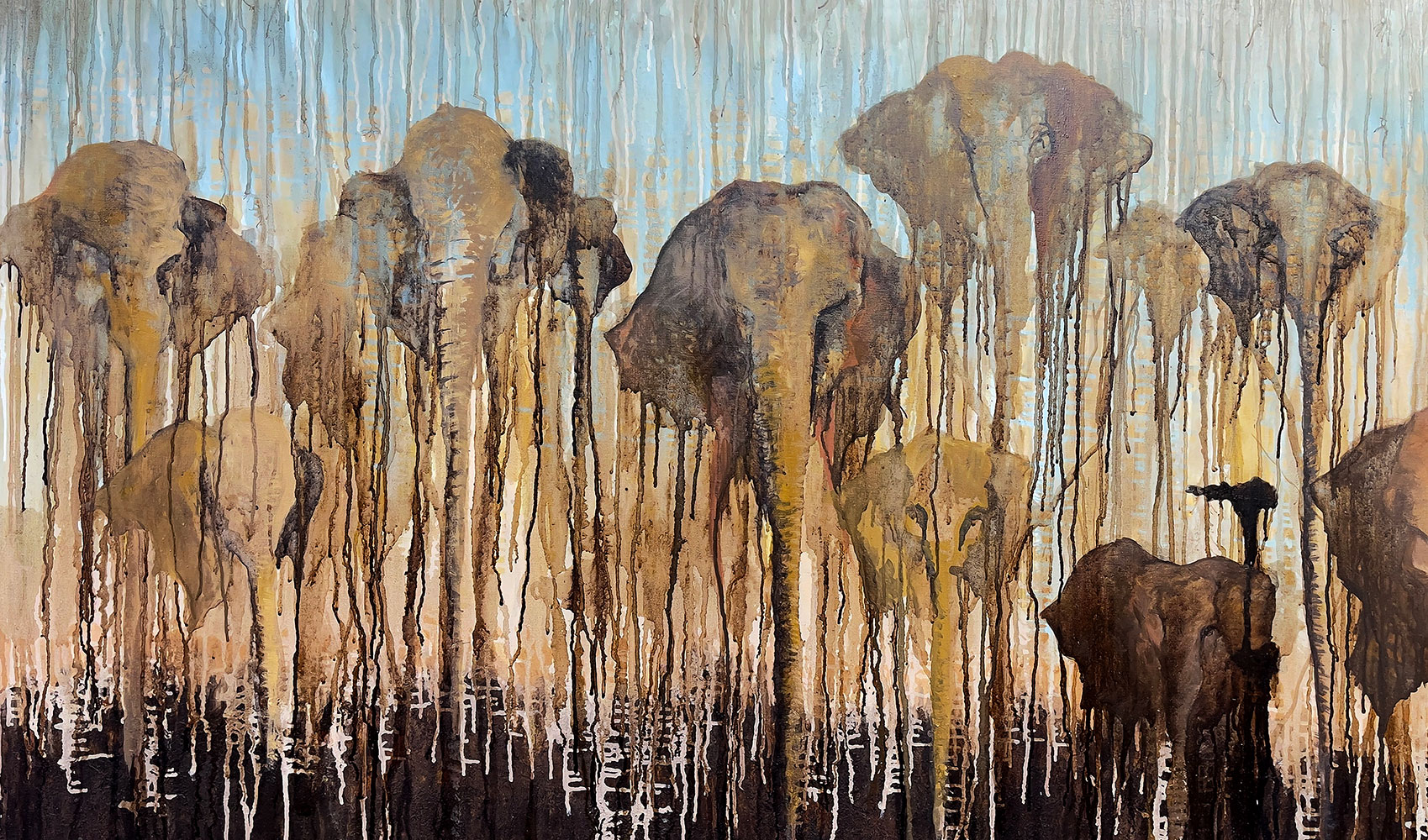 Les silhouettes d’éléphants émergent et se dissolvent dans l’épaisseur. Ils ne marchent pas: ils semblent flotter dans une cadence antérieure au temps, un murmure que la jungle n’a pas encore oublié. Leurs corps, faits de taches et de traits, se confondent avec le pouls végétal qui les entoure.
