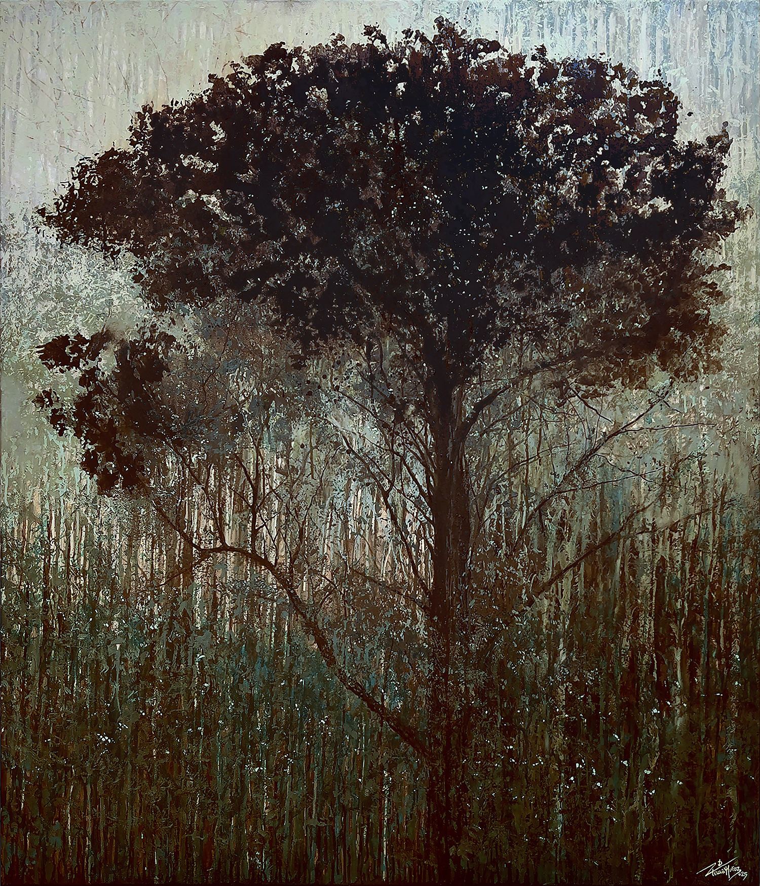 Un árbol joven —oscuro, casi una silueta— se eleva desde la espesura vegetal que no llega a configurar el bosque. Una paradoja entre lo múltiple y lo indiviso, lo informe y lo emergente. La fronda, aún indivisa, afirma su presencia singular frente a la densidad que la sostiene.
