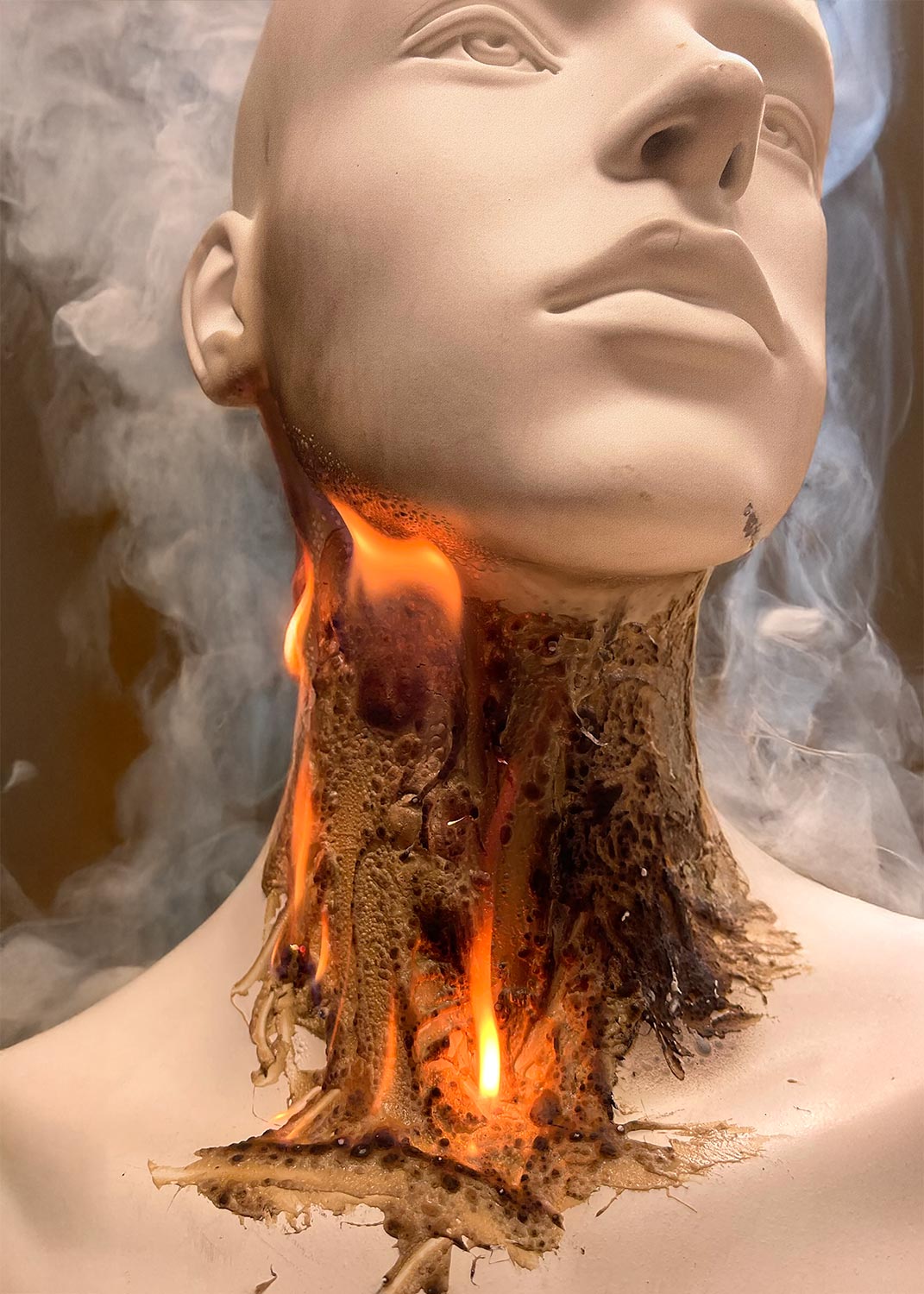 La surface blanche du visage introduit une condition de suspension. Elle n’est ni masque ni identité fixe, mais seuil : un territoire où la forme demeure intacte tandis que l’atmosphère environnante annonce sa transformation. Le feu n’envahit pas la figure depuis l’extérieur ; il émerge comme une atmosphère qui entoure, touche et finalement traverse. Dans cette ambiguïté, la combustion cesse d’être un événement violent pour devenir un lent processus de révélation.