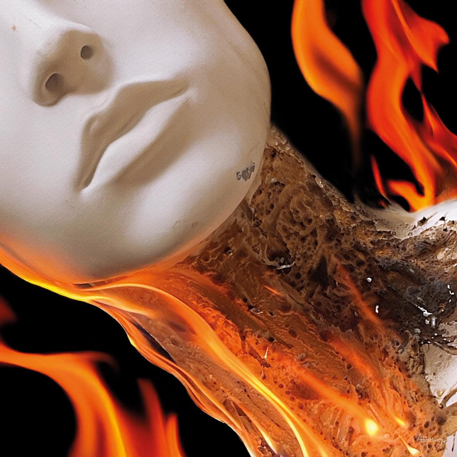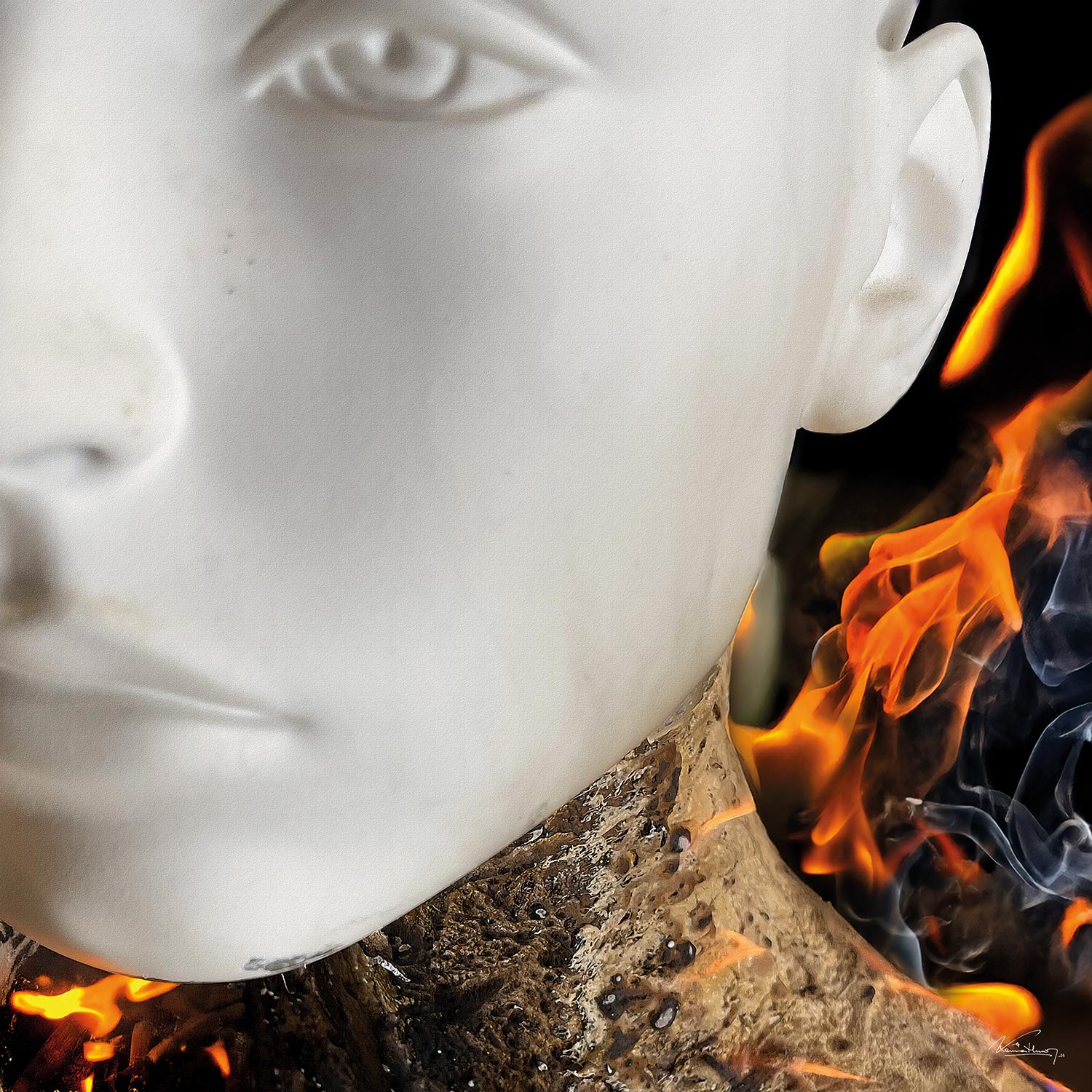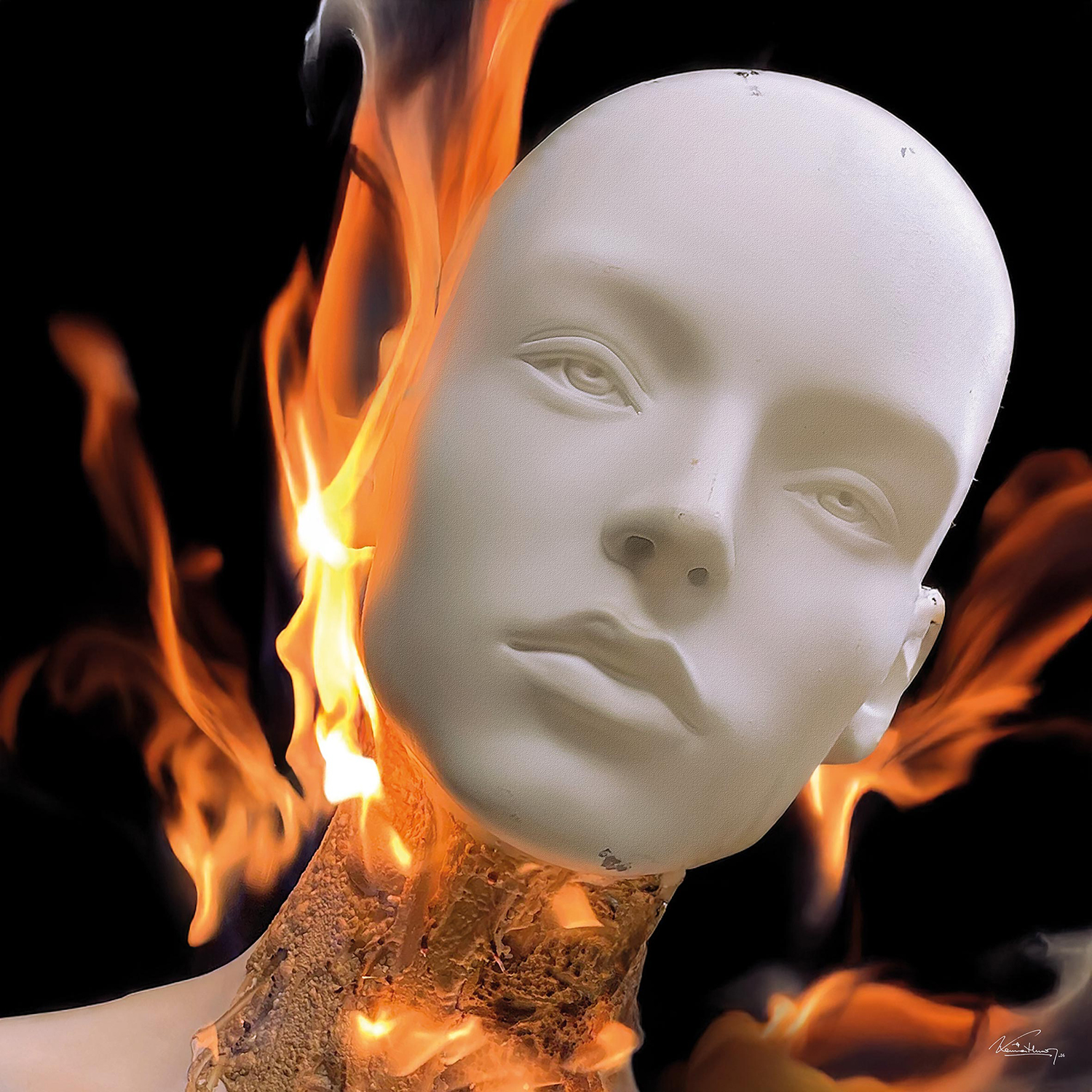 The white surface of the face introduces a condition of suspension. It is neither mask nor fixed identity, but threshold: a territory where form remains intact while the surrounding atmosphere announces its transformation. Fire does not invade the figure from outside; it emerges as an atmosphere that surrounds, touches, and ultimately passes through. Within this ambiguity, combustion ceases to be a violent event and becomes a slow process of revelation.